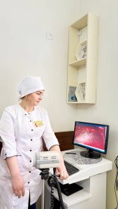 Возглавляет отделение функциональной диагностики врач с большим опытом, кандидат медицинских наук, доцент, врач высшей категории Нарзуллаева Зарина Рахматуллаевна. Под ее руководством работает 33 сотрудника, врачи в основном с высшей и первой квалификационной категорией, доценты, врачи большим стажем работы, клиницисты, научные сотрудники. В отделении проводятся следующие виды исследований: ультразвуковые исследования, в частности скрининг ультразвуковое исследование плода, допплерометрия C плода, плода, ультразвуковые исследования органов брюшной полости, узи почек И мочевыводящих путей, молочных кольпоскопия, исследования мужских половых органов, желёз, исследование шейки матки общая ренгенография. Также в отделении проводится ЭКГ- электрокардиография. Для определения степени остеопороза, уровня кальция, риска перелома костей и плотности костной ткани проводится Денситометрия.